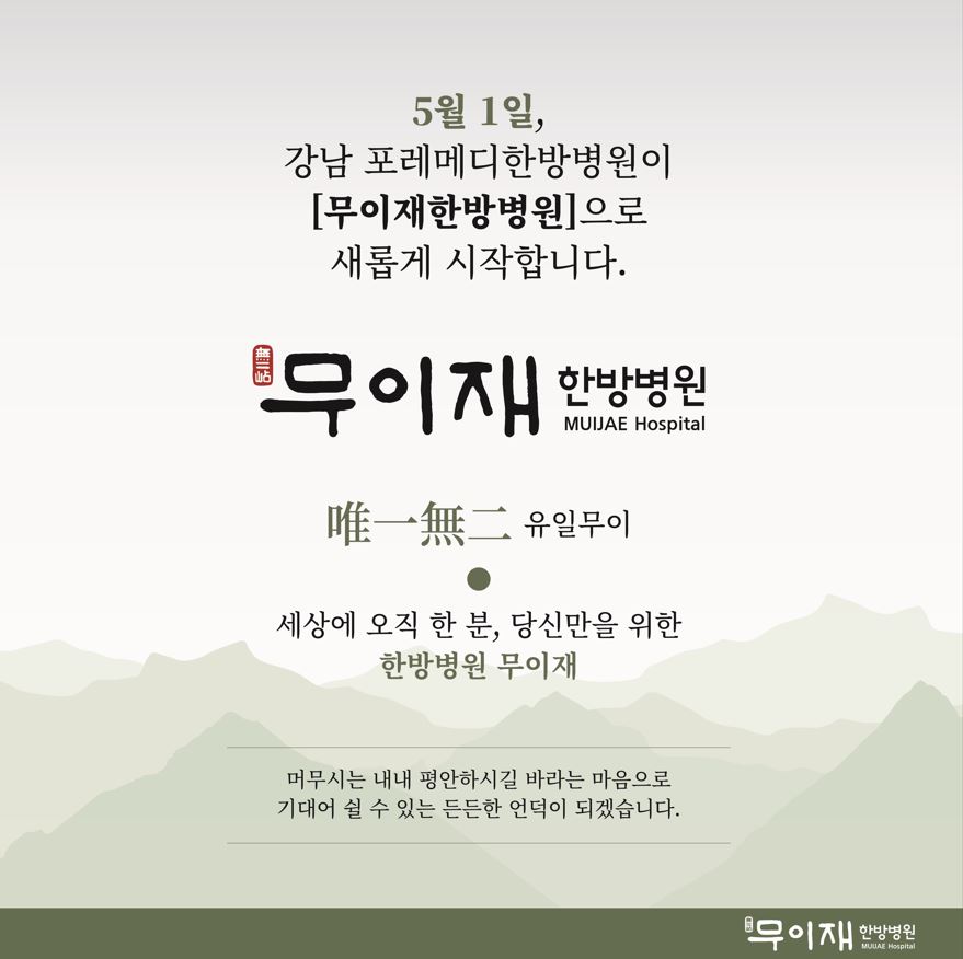 MUYJAE’s Focus 강남, 부산, 강동을 잇는 체계적인 의료서비스 무이재한방병원은 서울 강남과 부산, 그리고 강동 무이재의원으로 전국 네트워크를 통해 표준화된 고품질 의료 서비스를 제공합니다. 통합 양한방 협진을 통한 정밀 맞춤 치료 한의학 치료와 의학 치룔르 통해 환자의 상태에 따른 1:1 맞춤형 처방으로 치료의 효율은 높이고, 빠른 회복을 돕습니다. 무이 시리즈, 암 환자를 위한 신약 개발 환자의 체질과 상태는 모두 다르기에 무이재의 한약은 환자의 민감도에 따라 정밀하게 농도를 조절하고 끊임없는 연구 개발을 통해 약효의 안정성을 확보하고, 철저한 검수 시스템을 거쳐 환자분들에게 전달됩니다. 간호등급차등제 평가 최고 A등급 암환자의 의료서비스의 질을 개선하고자 간호사 수 확충을 통한 간호 서비스의 질을 높이기 위해 최선을 다하고 있으며 빠른 회복과 편안한 입원 치료 환경을 제공합니다. 고주파온열암치료, 대한온열의학회와 공동 연구 질병예방 및 치료, 항암치료와 고주파온열암치료의 동시 치료에 의한 시너지 효과 등 통합진료를 통한 다양한 임상효과 연구를 진행하고 있습니다.