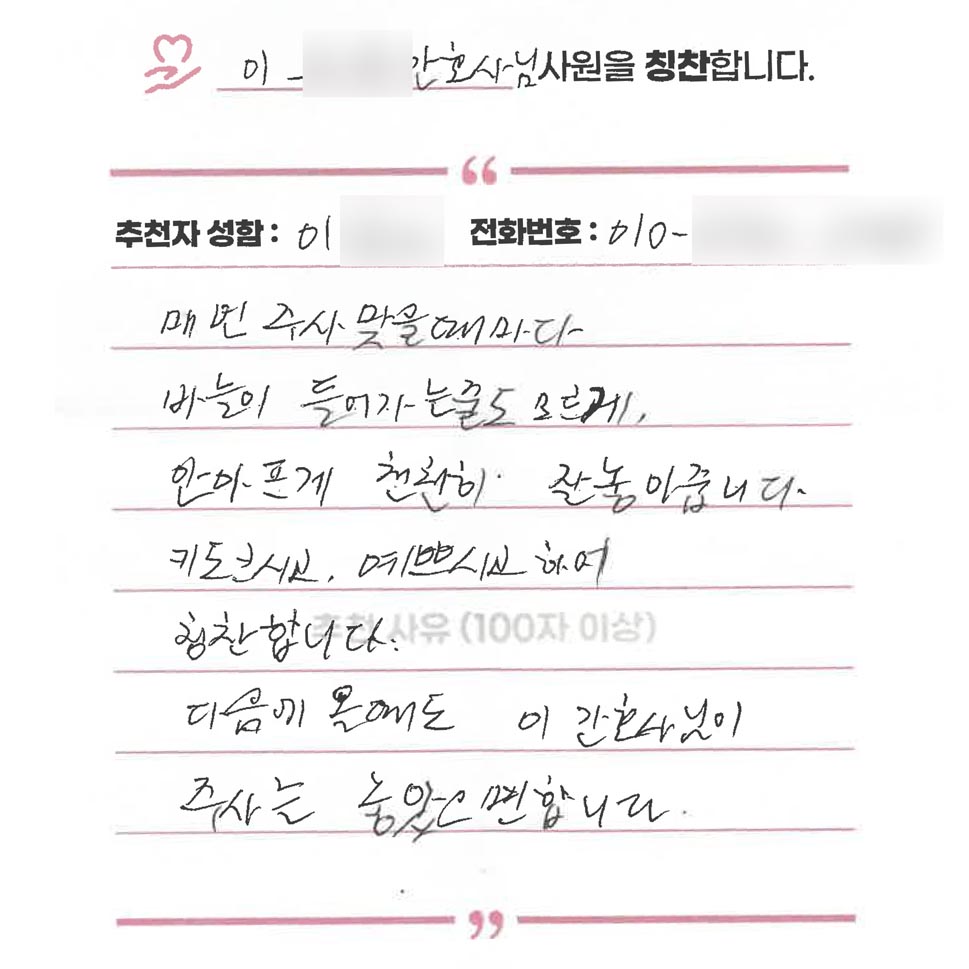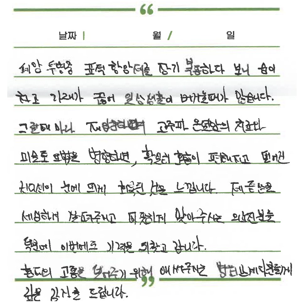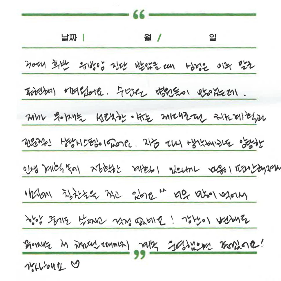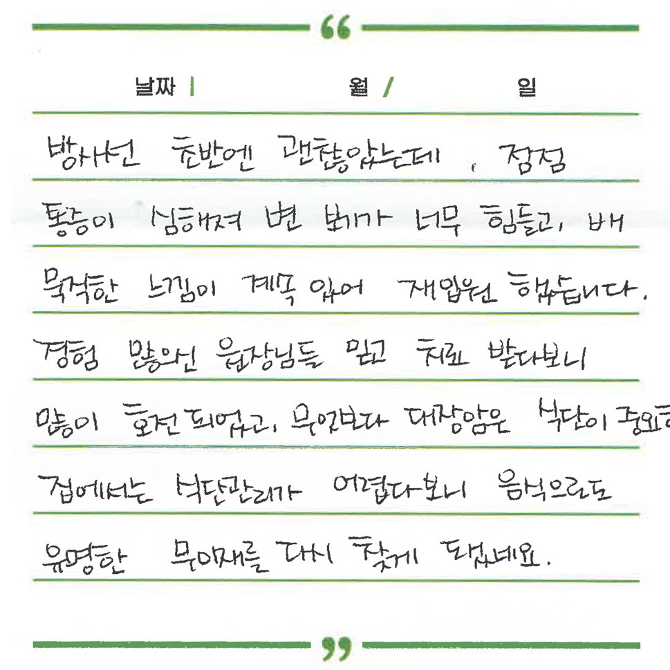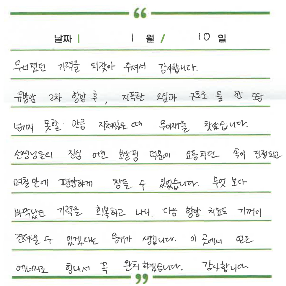 무이재 연구소식 장(腸)이 살아야 면역이 산다 : 장내미생물(마이크로바이옴)과 한의학적 통합 암 관리 2026.03.17 [월간 무이재] 암 환자에게 유용한 한방 치료 이야기 2026.02.23 대장암 수술 후 회복을 돕는 ‘저잔사식’ 완벽 정리 2026.02.23 치료후기 이00 간호사님을 칭찬합니다. 유방암 김00님 2026.03.17 세심한 보살핌 속에 되찾은 평온함 호흡 유방암 김00님 2026.03.04 지친 몸을 보듬어준 정성 어린 식탁의 위로 유방암 김00님 2026.03.03 암담했던 길 위에서 마주한 든든한 나침반 유방암 김00님 2026.03.01 무거운 일상에 빛이 된 따뜻한 손길 유방암 김00님 2026.01.12 무녀졌던 기력을 되찾아준 치유의 에너지 유방암 김00님 2026.01.10